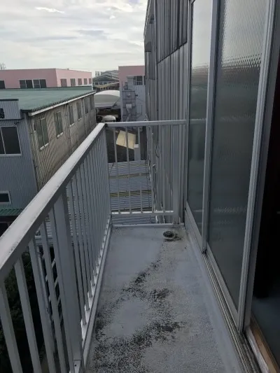 3階からの設置状況です。写真正面のアルミ製の手摺を撤去し、設置します。