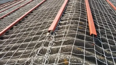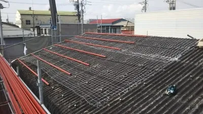施⼯中の墜落防⽌⽤にネットを敷き、追加した⾦具に固定をしていきます。新しい屋根を固定するための下地となる鉄⾻です。